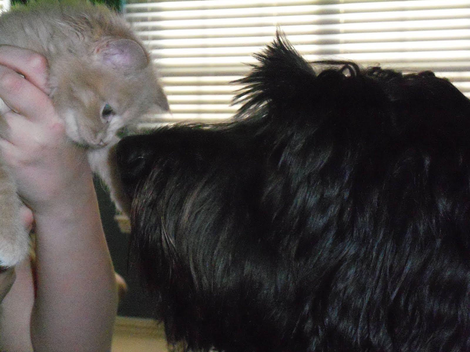 Here are a few more pictures of the kittens! The first is Sawyer and Hilo meeting. Hilo becomes very excited around the kittens, and I actually think the kittens like her too. The best way, right now, for them to play, is for me to hold Sawyer and then Hilo sits on the end of my bed. That way she doesn’t jump and if she gets to crazy I can step back and put space between us. Hilo has gotten very good about sitting. When I do this, Sawyer begins purring. Hilo noses the kitten, licks her, and Sawyer licks her back and rubs his head against Hilo’s. Very sweet!