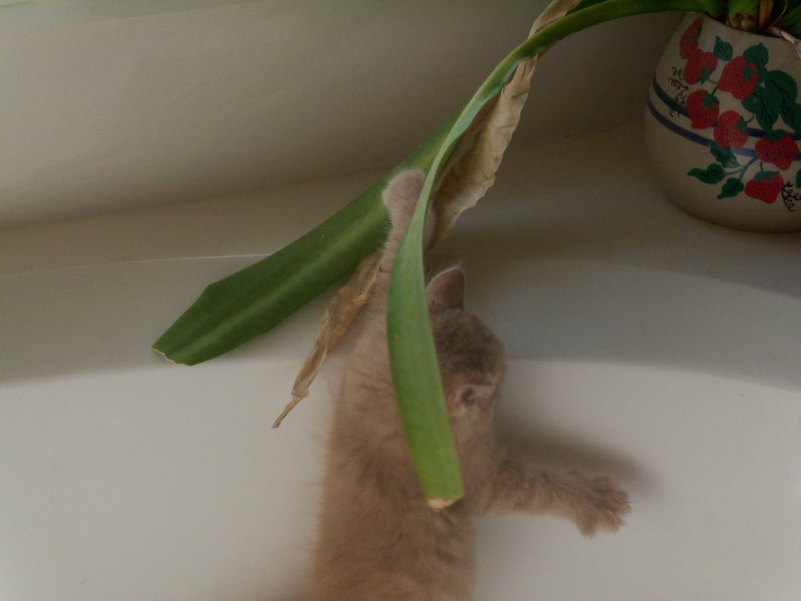 The kittens like to jump to the edge of my bathtub. I found them one morning playing around the plants on the far edge, which are next to the window. Sawyer lost his balance and made a grab for the leaf but he ended up sliding into the bathtub. They are very adventurous and a lot of fun to watch.