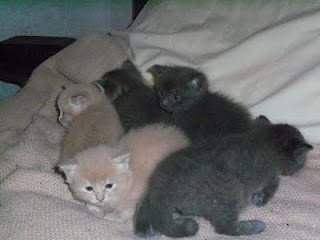 Our kitten is the little blond one, hiding behind the gray one. My sister is adopting the gray one. We could use some suggestions for that name too! They are both female, or so we hope!
